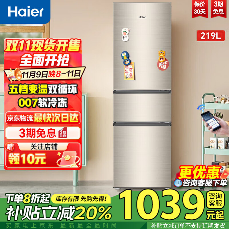包邮 海尔冰箱219升三开门冰箱小型家用电器宿舍租房小冰箱多温区保鲜冷冻节能低噪超薄国家补贴以旧换新 219升三门直冷节能丨007软冷冻